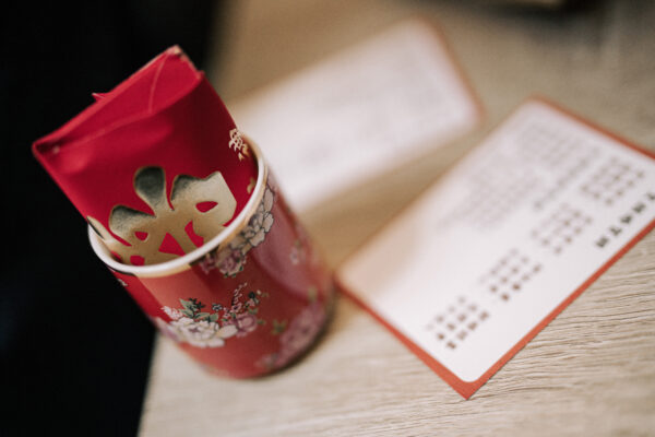 男方親友喝完茶後,將紅包捲入茶杯內壓住,稱為「壓茶甌」。