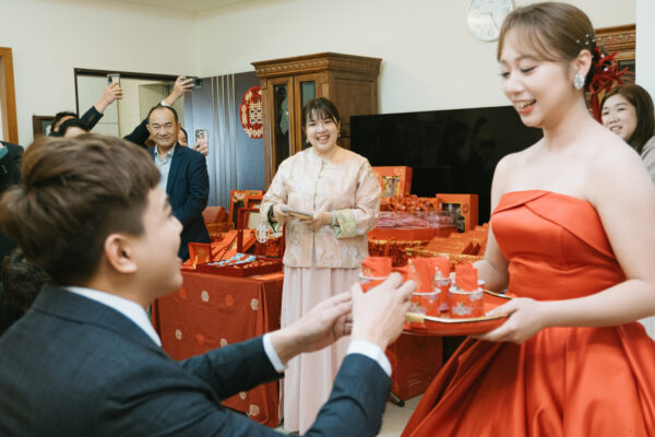 新娘由好命婆牽出,捧甜茶敬男方親屬,象徵甜蜜圓滿。
